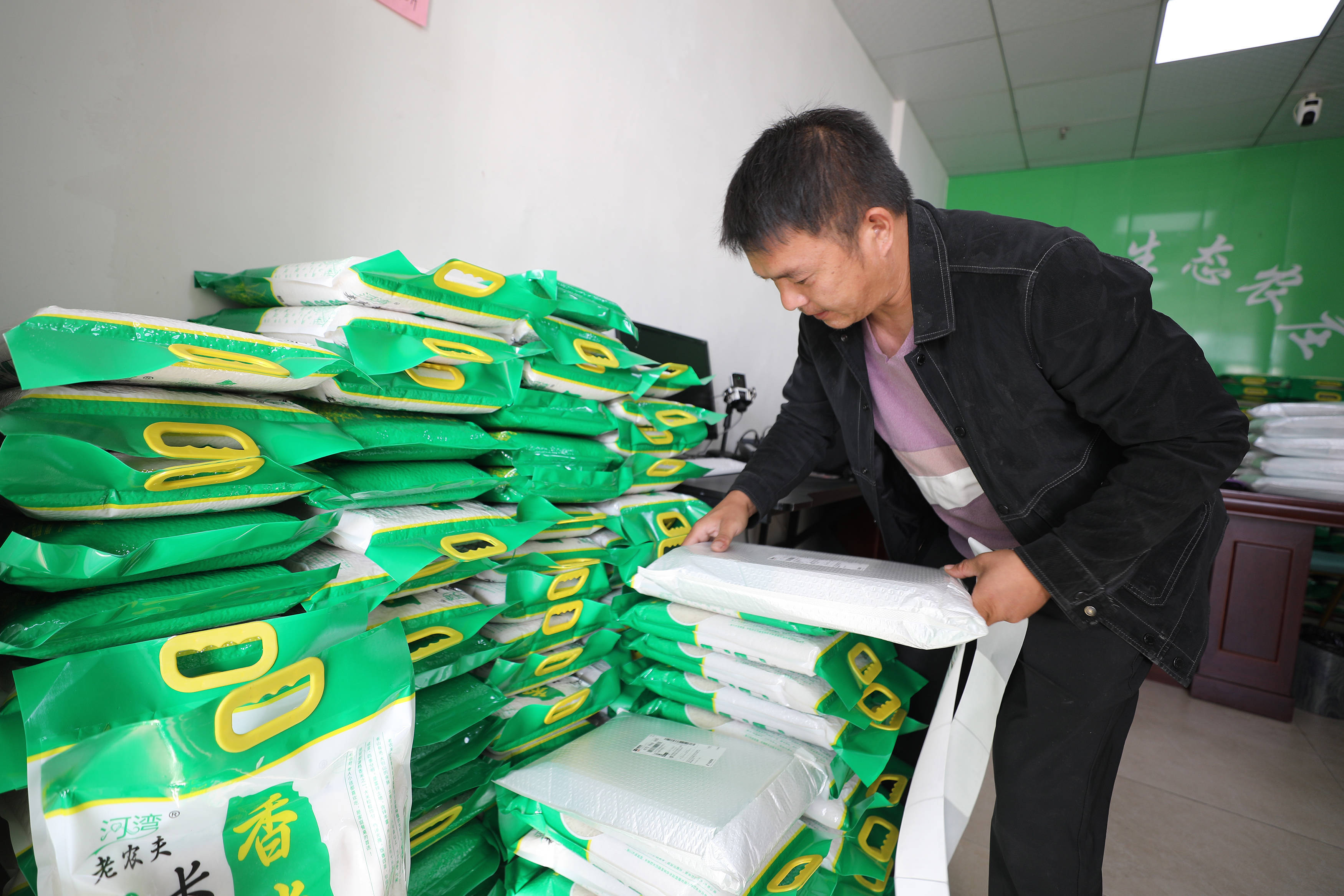 王甜甜在桐城市的店铺里打包自家的成品米,准备发给直播间里下单的顾客。