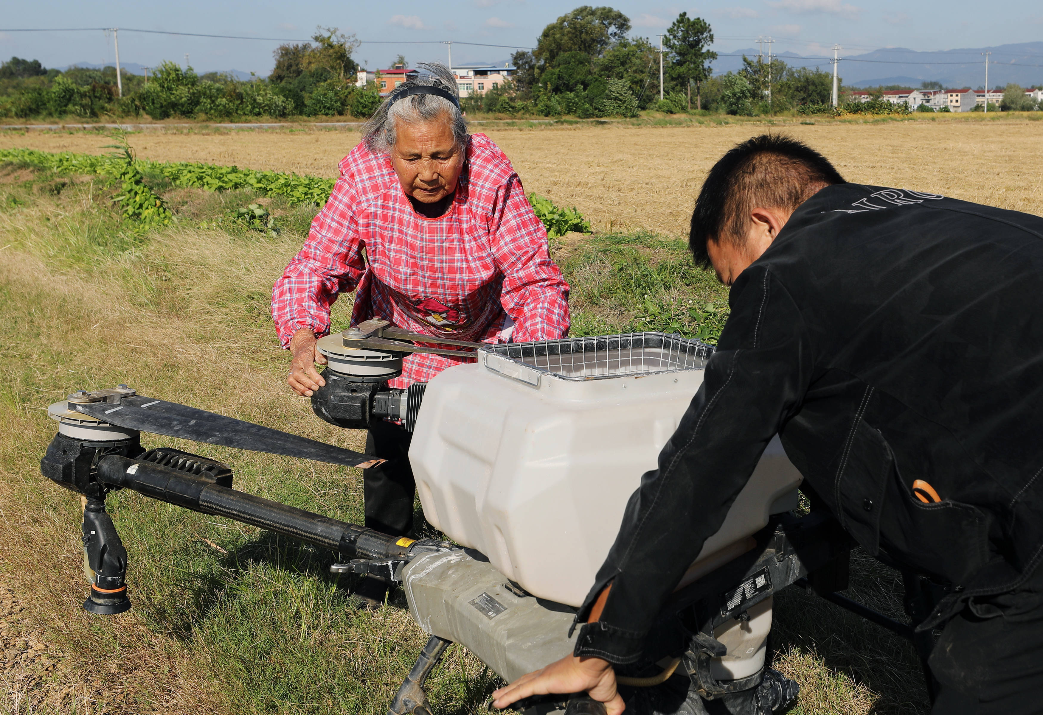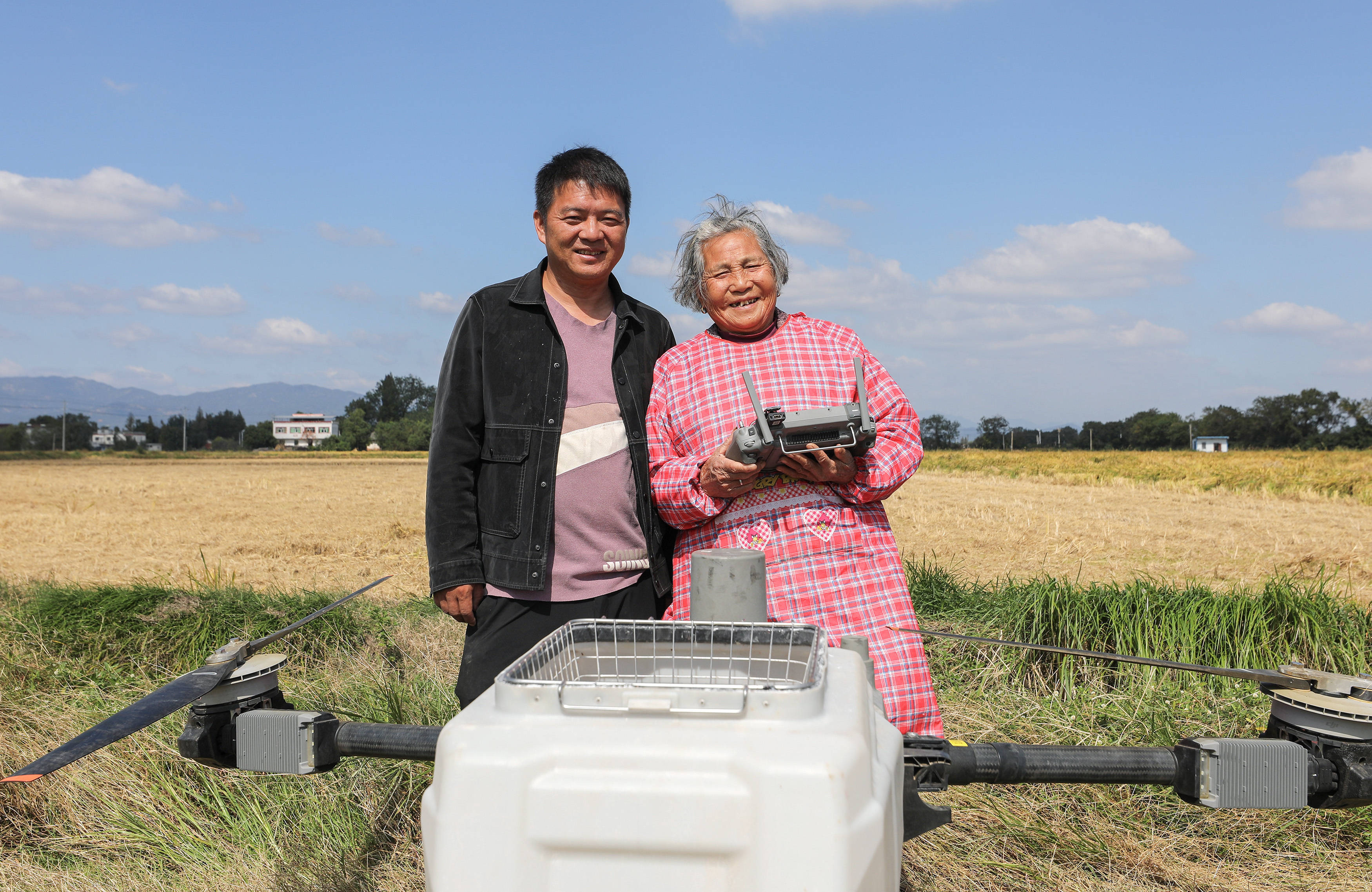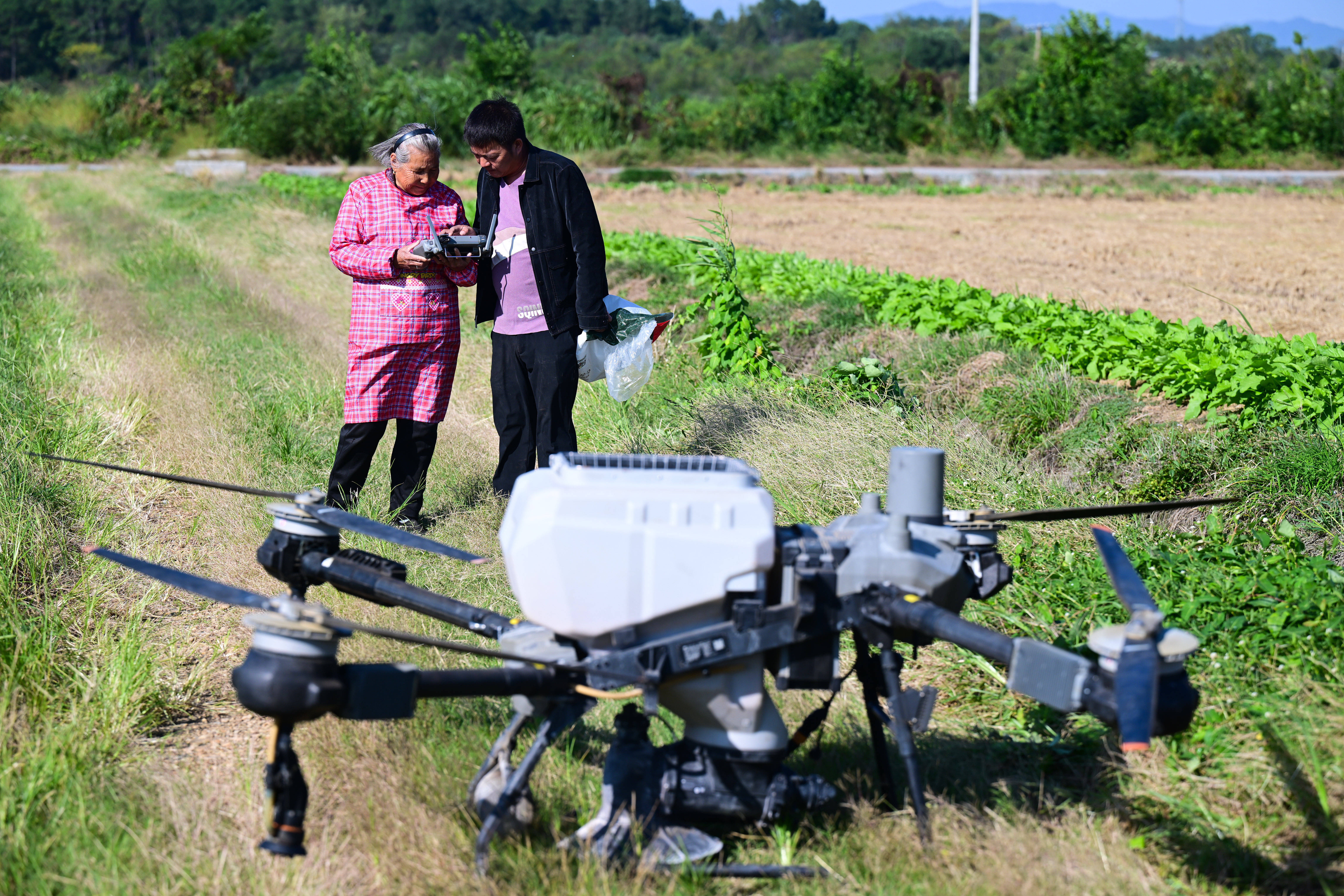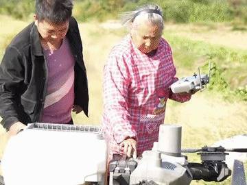 戴淑英(左)在王甜甜的指导下操作植保无人机。虽然奶奶已经学会