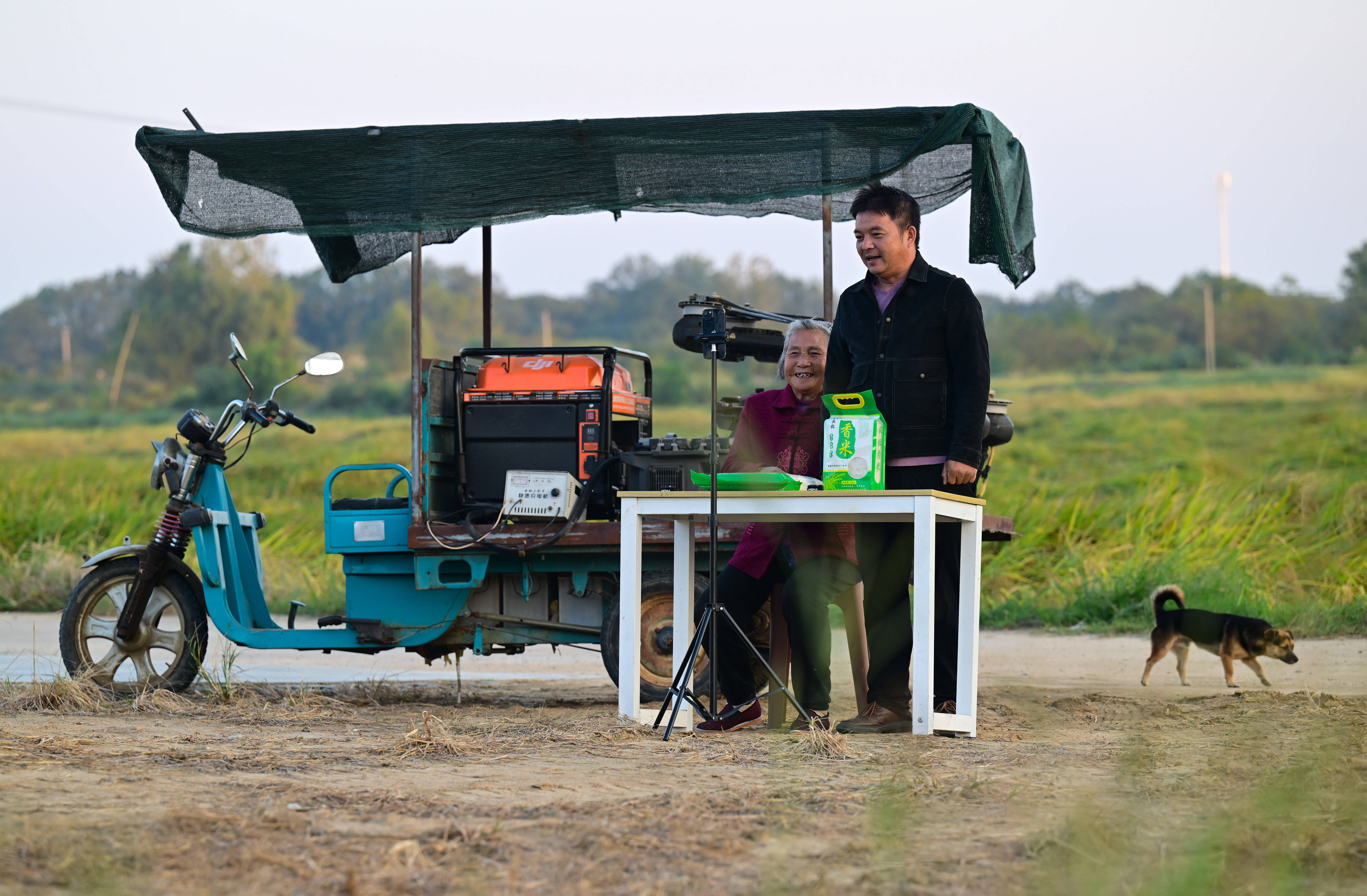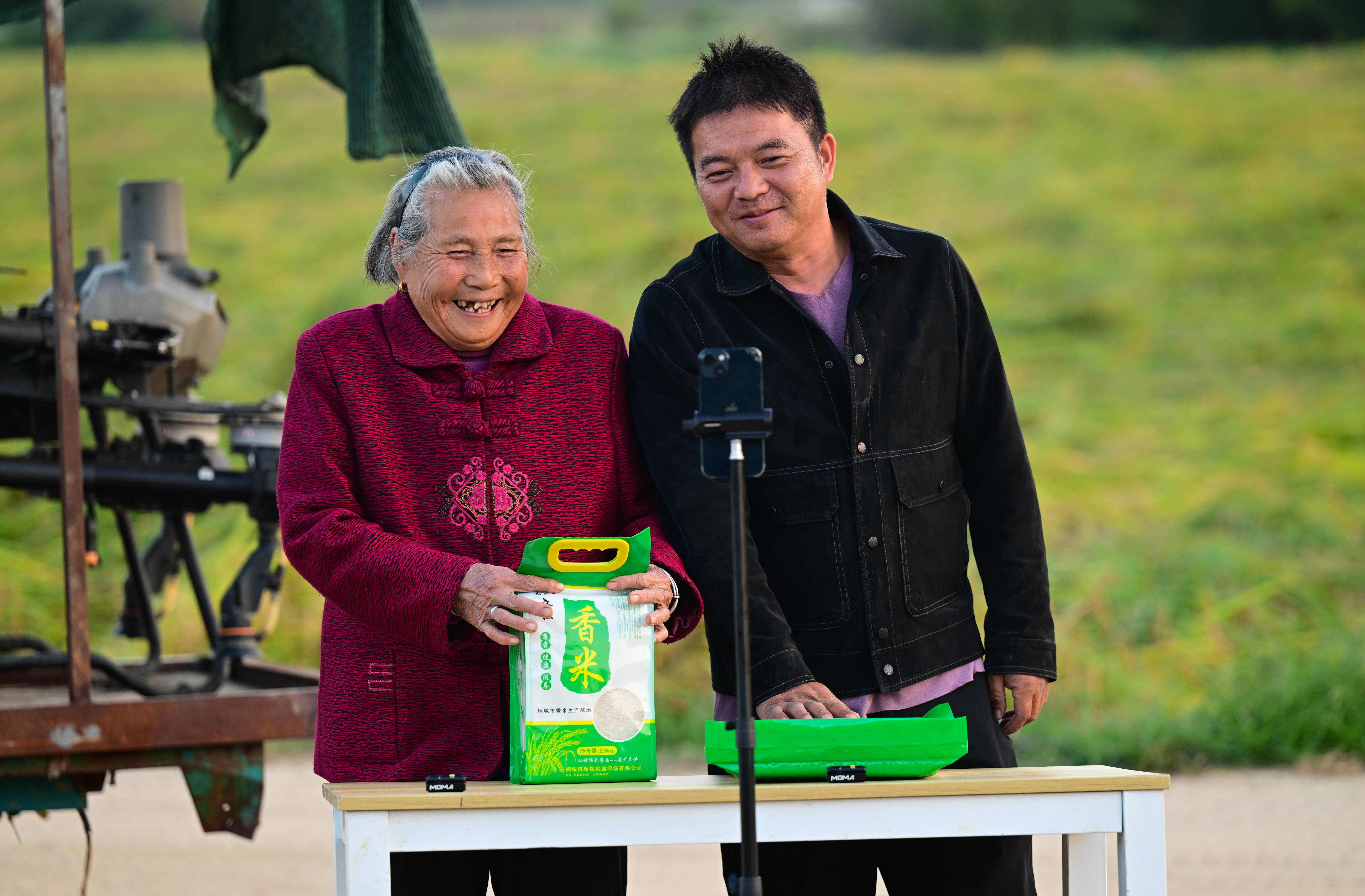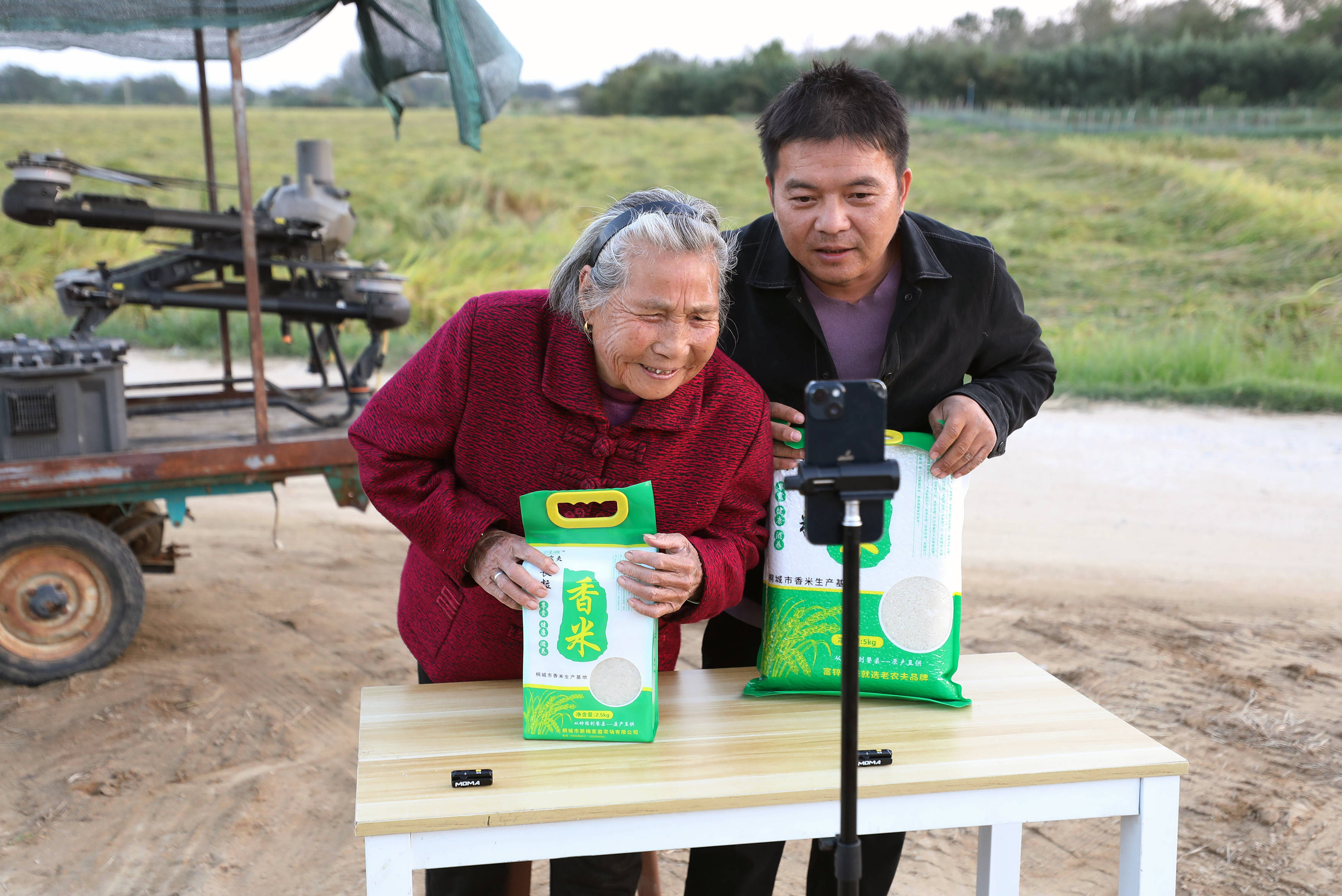 戴淑英(左)在王甜甜的指导下操作植保无人机。虽然奶奶已经学会