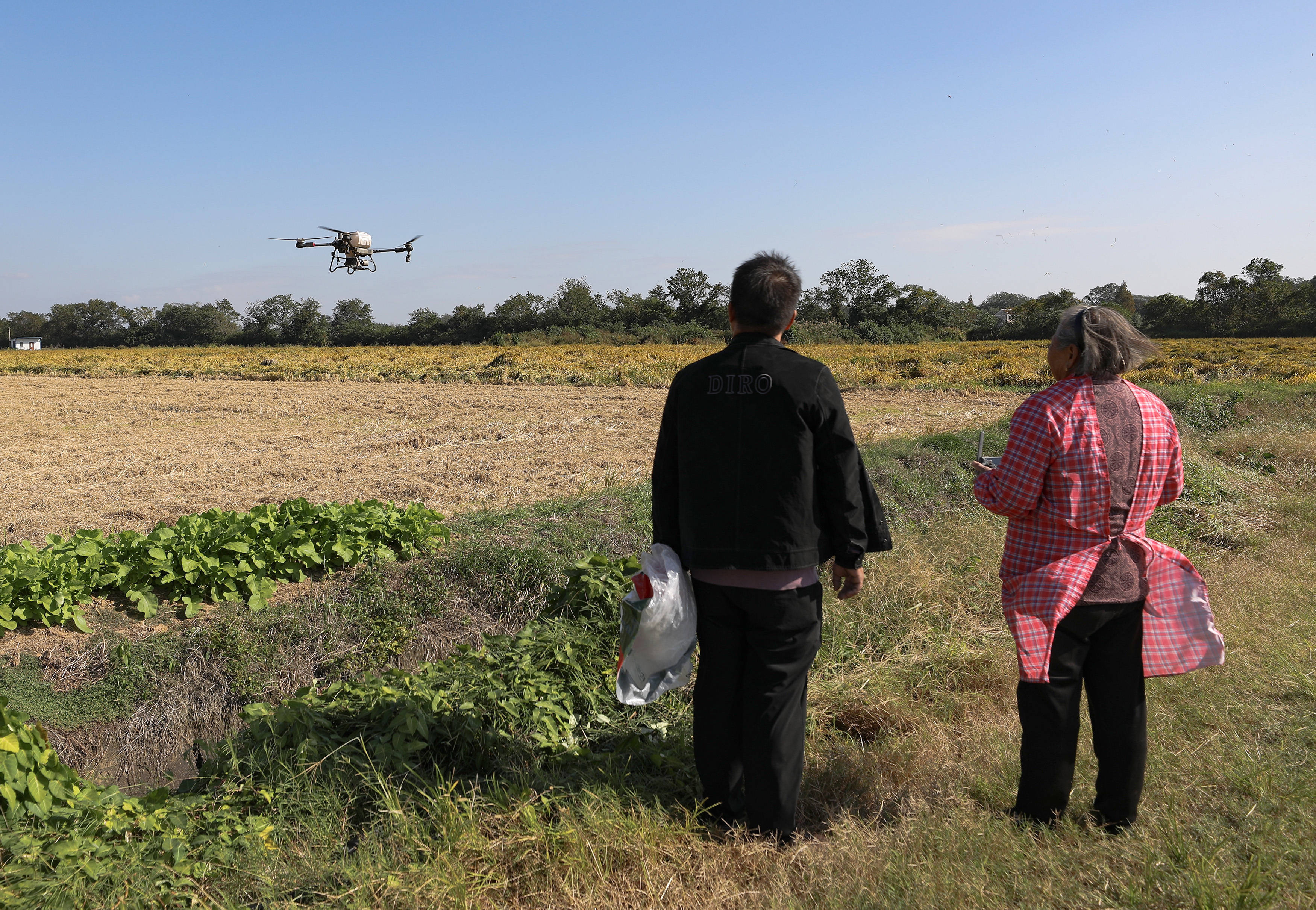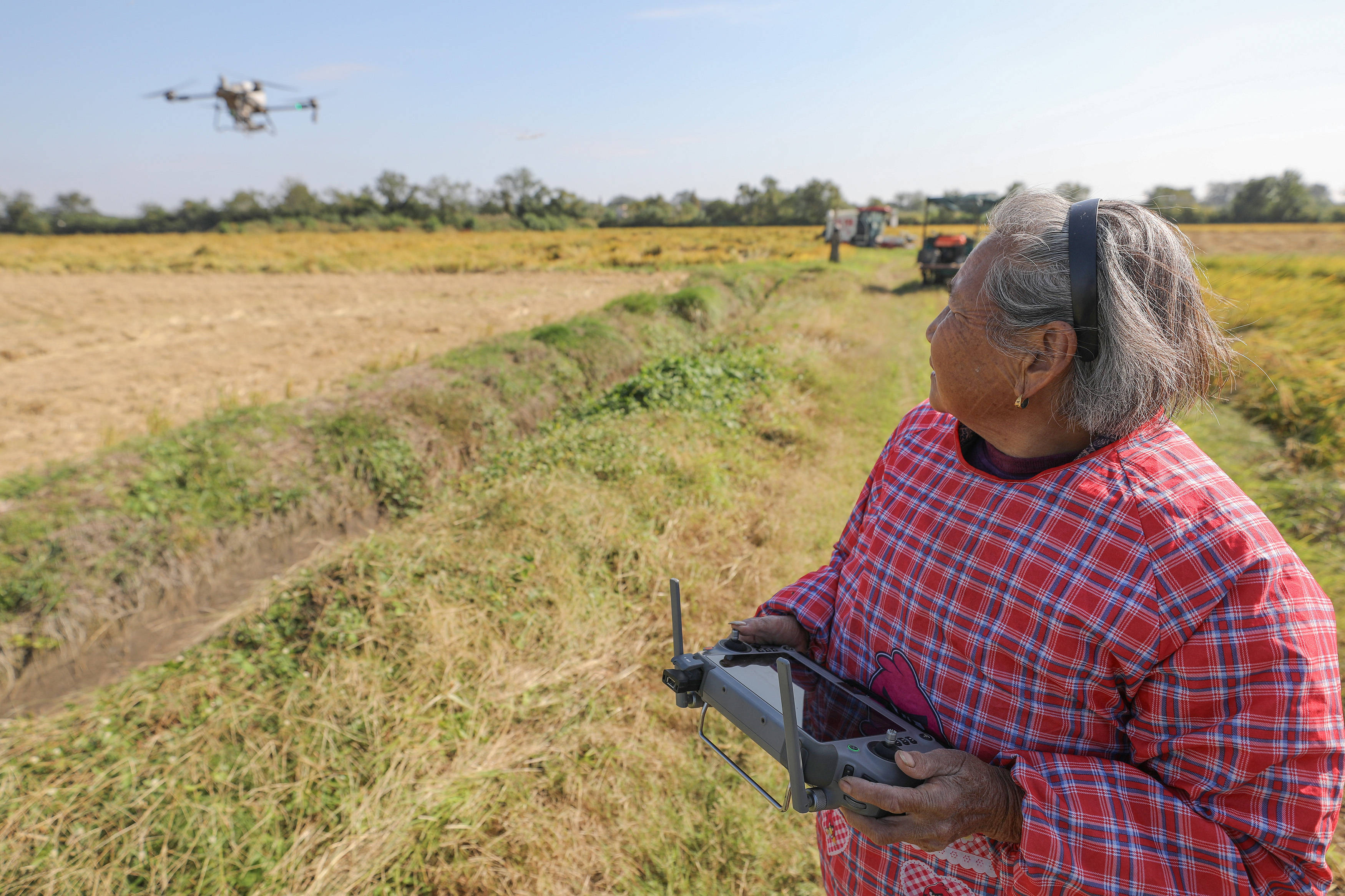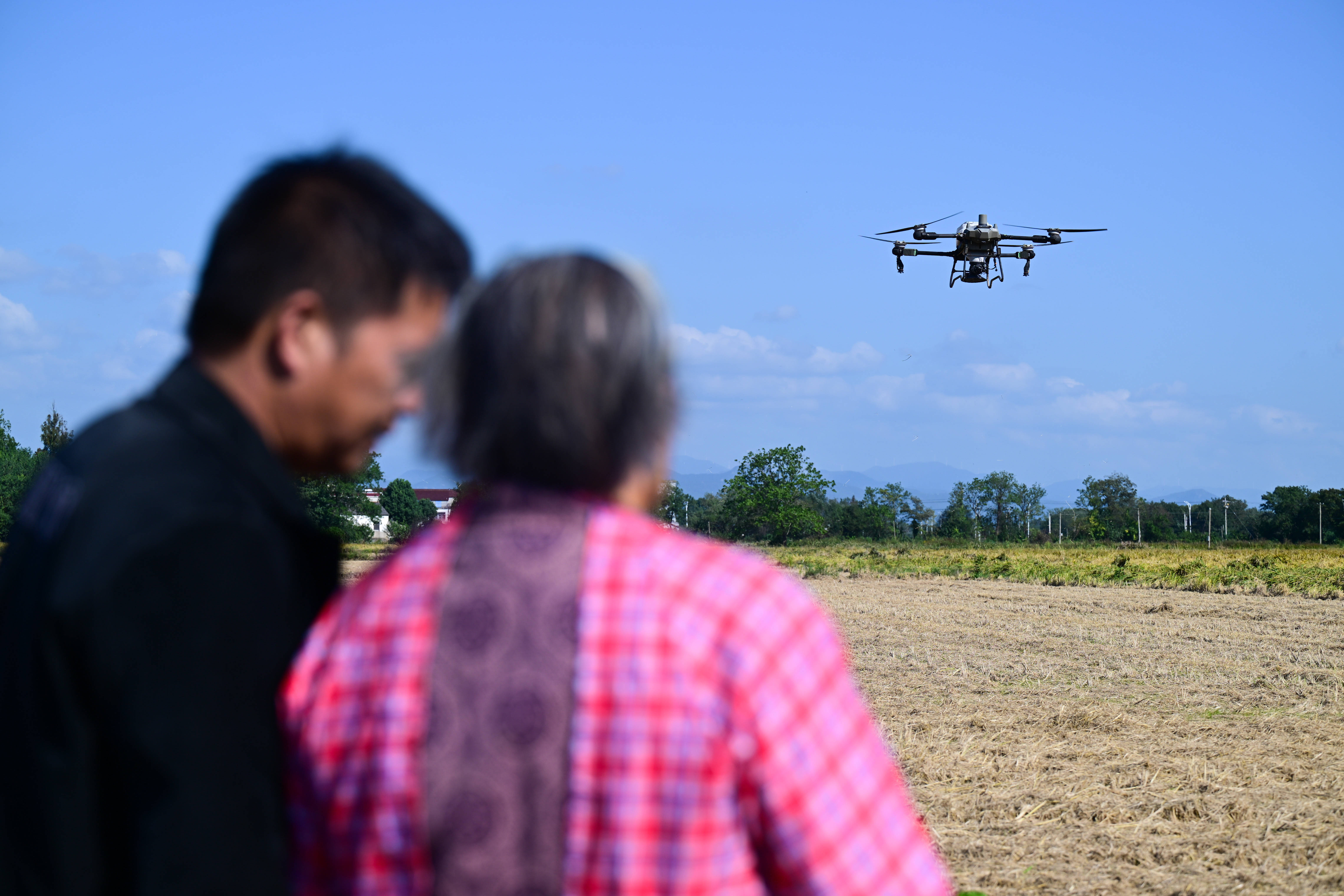 戴淑英观察植保无人机的飞行情况。