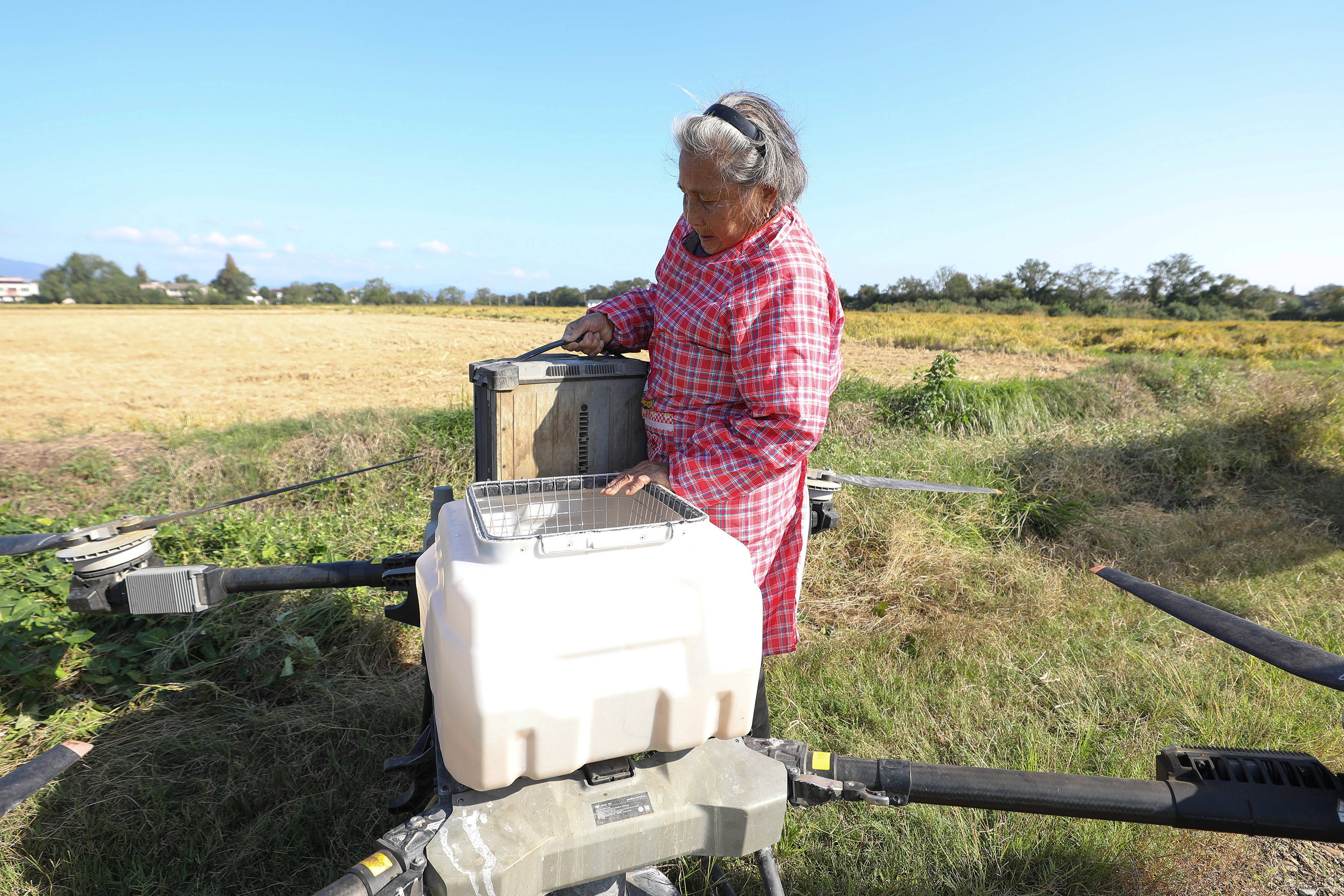 戴淑英(左)和王甜甜为植保无人机起飞做准备。