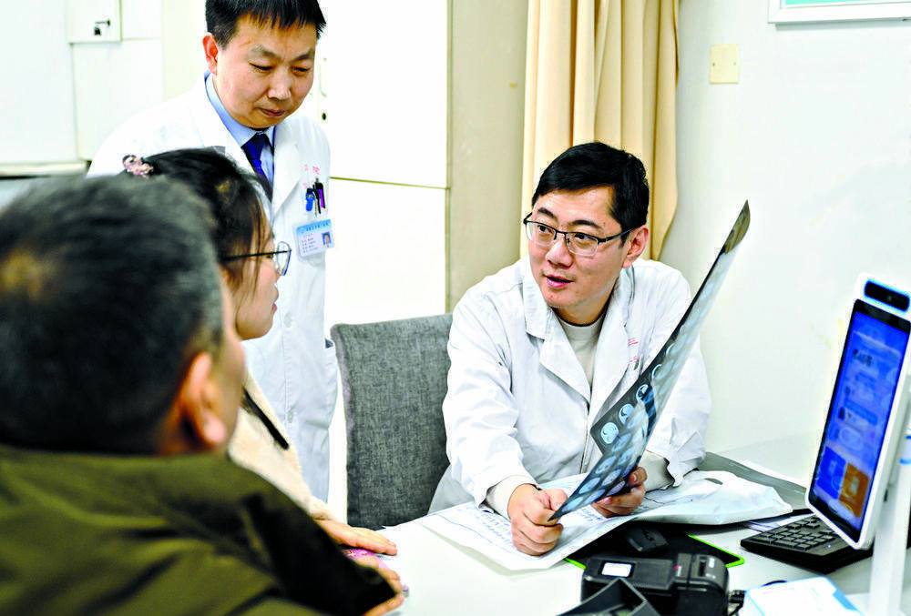 在石家庄市第三医院,来自中国医学科学院肿瘤医院胸外科的专家李放(右一)在为患者进行诊疗。 记者 张震 摄