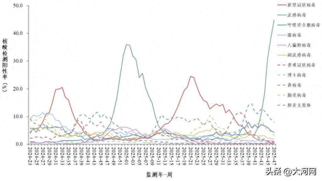 哨点医院门急诊流感样病例呼吸道样本病原体核酸检测阳性率每周变化趋势。《全国急性呼吸道传染病哨点监测情况(2025年第47周)》图